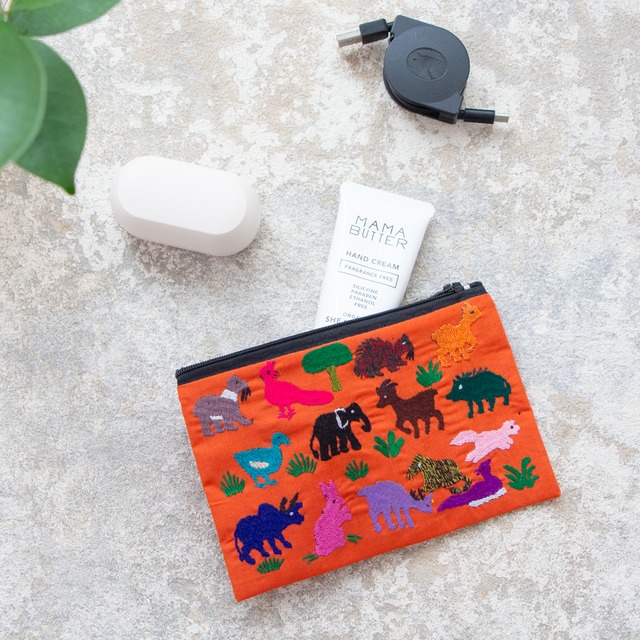 ラオス×モン族のアニマル刺繍ポーチM (オレンジ)