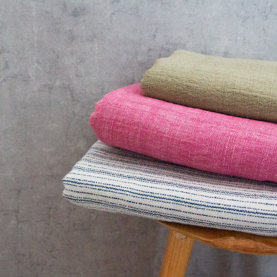 村人の手で一つ一つ丁寧に作り上げる生地で、シワや、色むら、織むらがございます。
