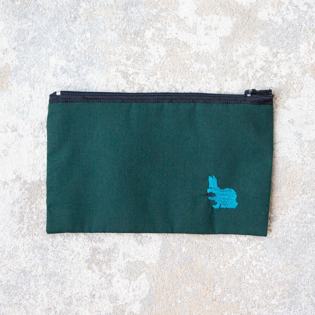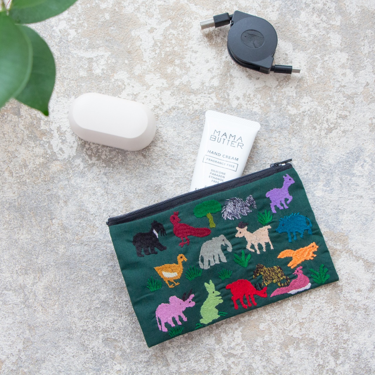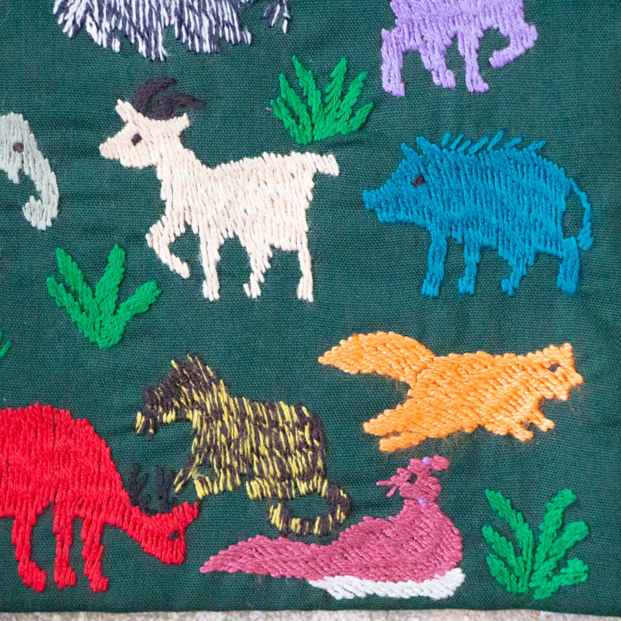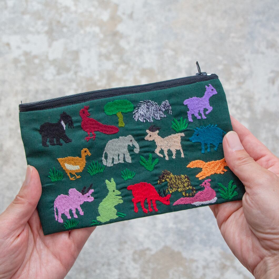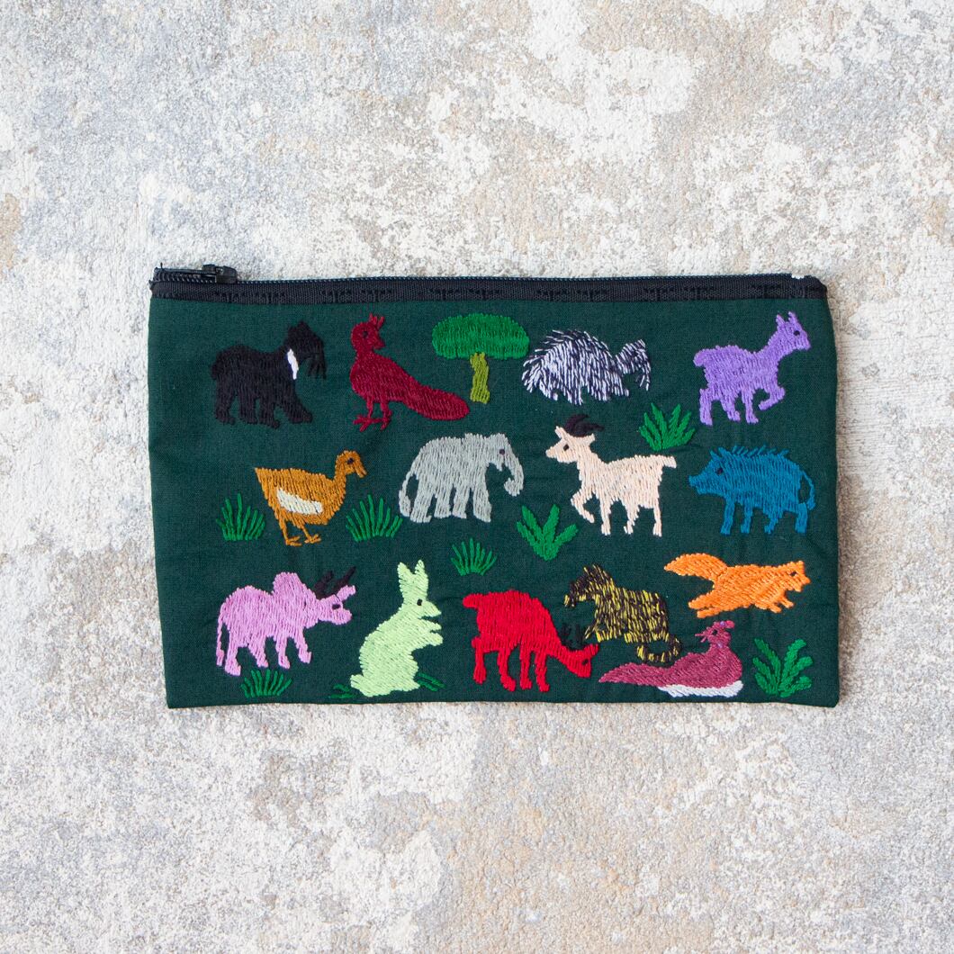 ラオス×モン族のアニマル刺繍ポーチM (グリーン)
