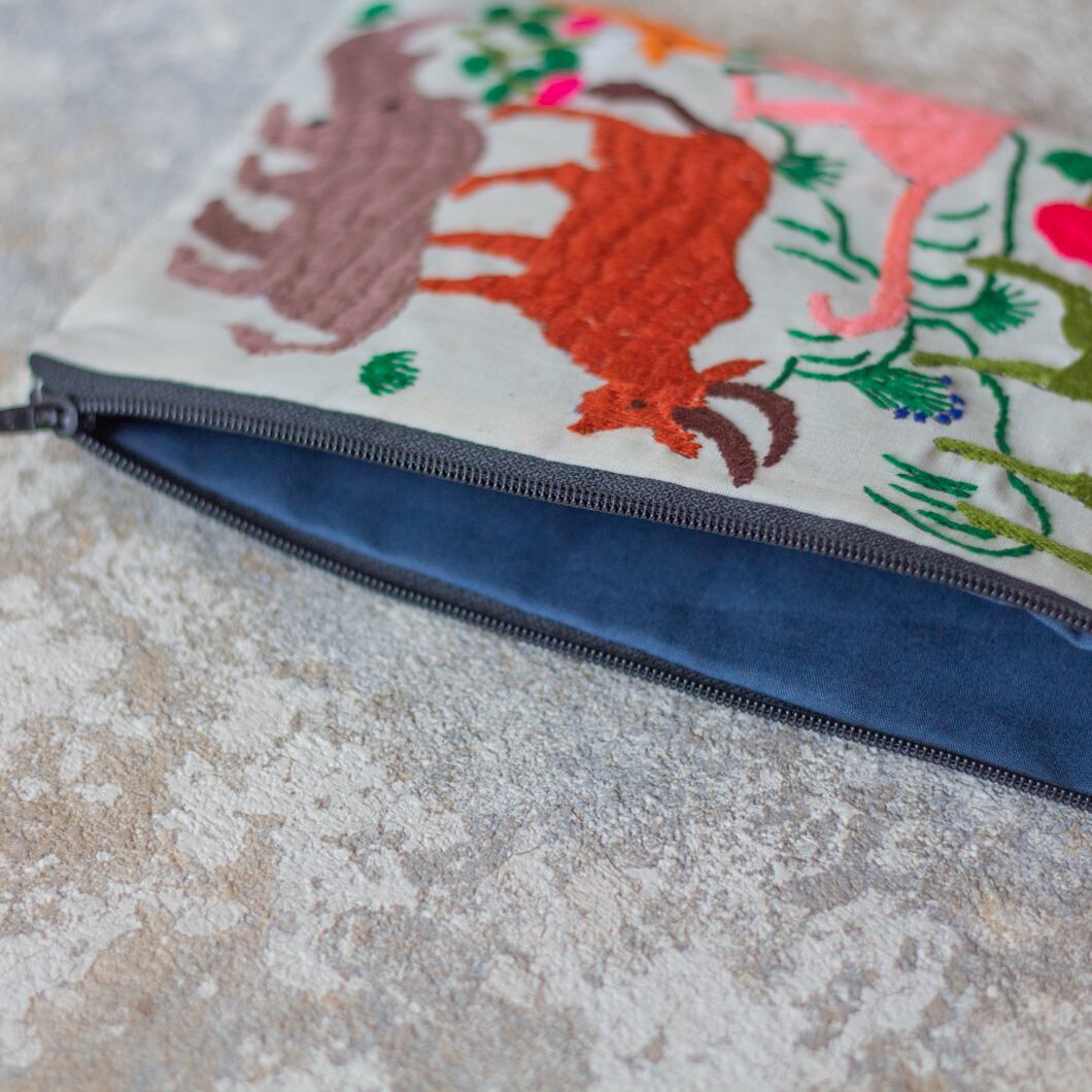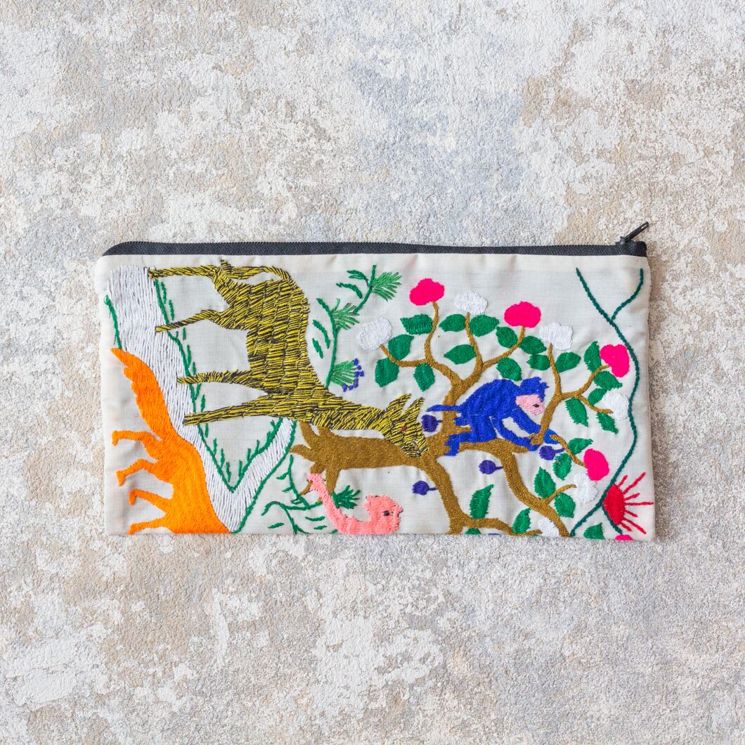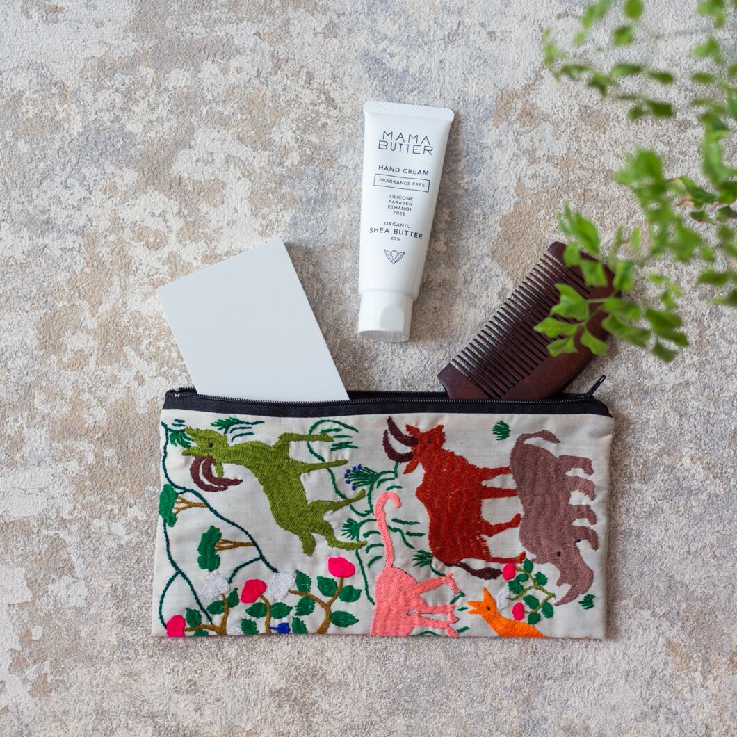 ポーチ全体に施されている動物の刺繍は、ひとつひとつがモン族の女性による手仕事です。