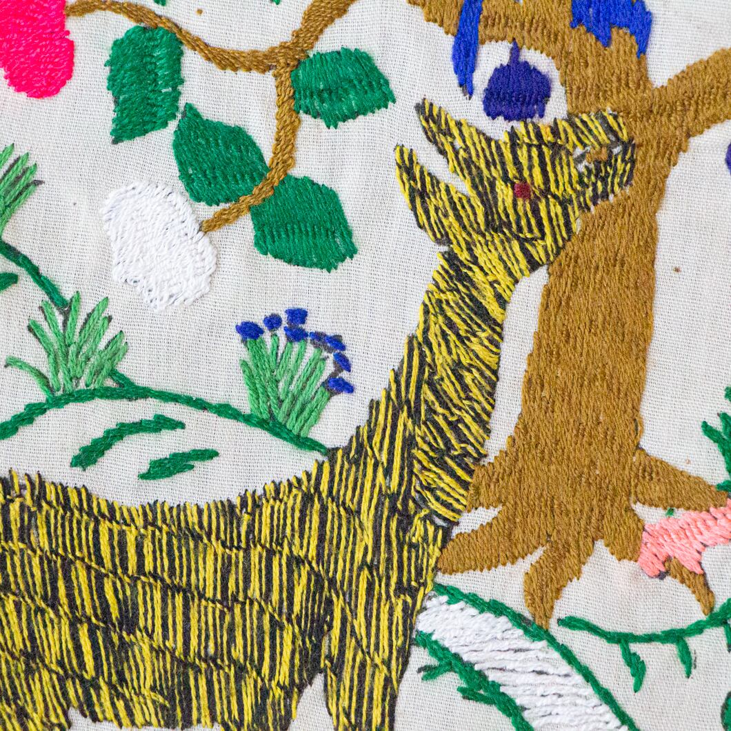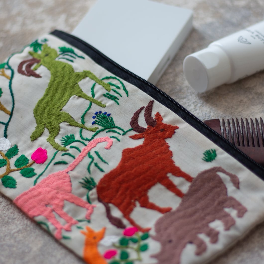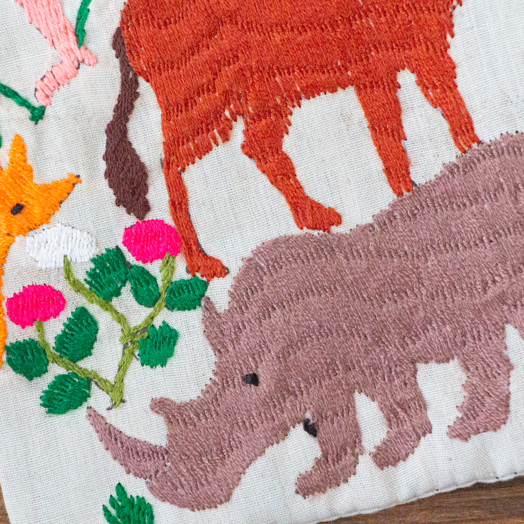 ポーチ全体に施されている動物の刺繍は、ひとつひとつがモン族の女性による手仕事です。
