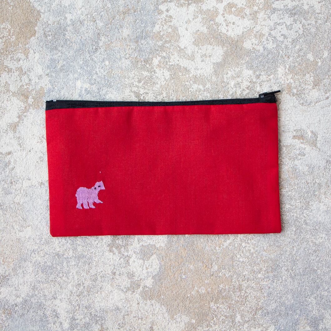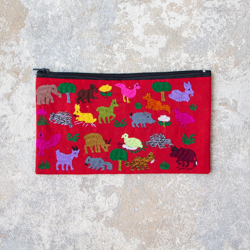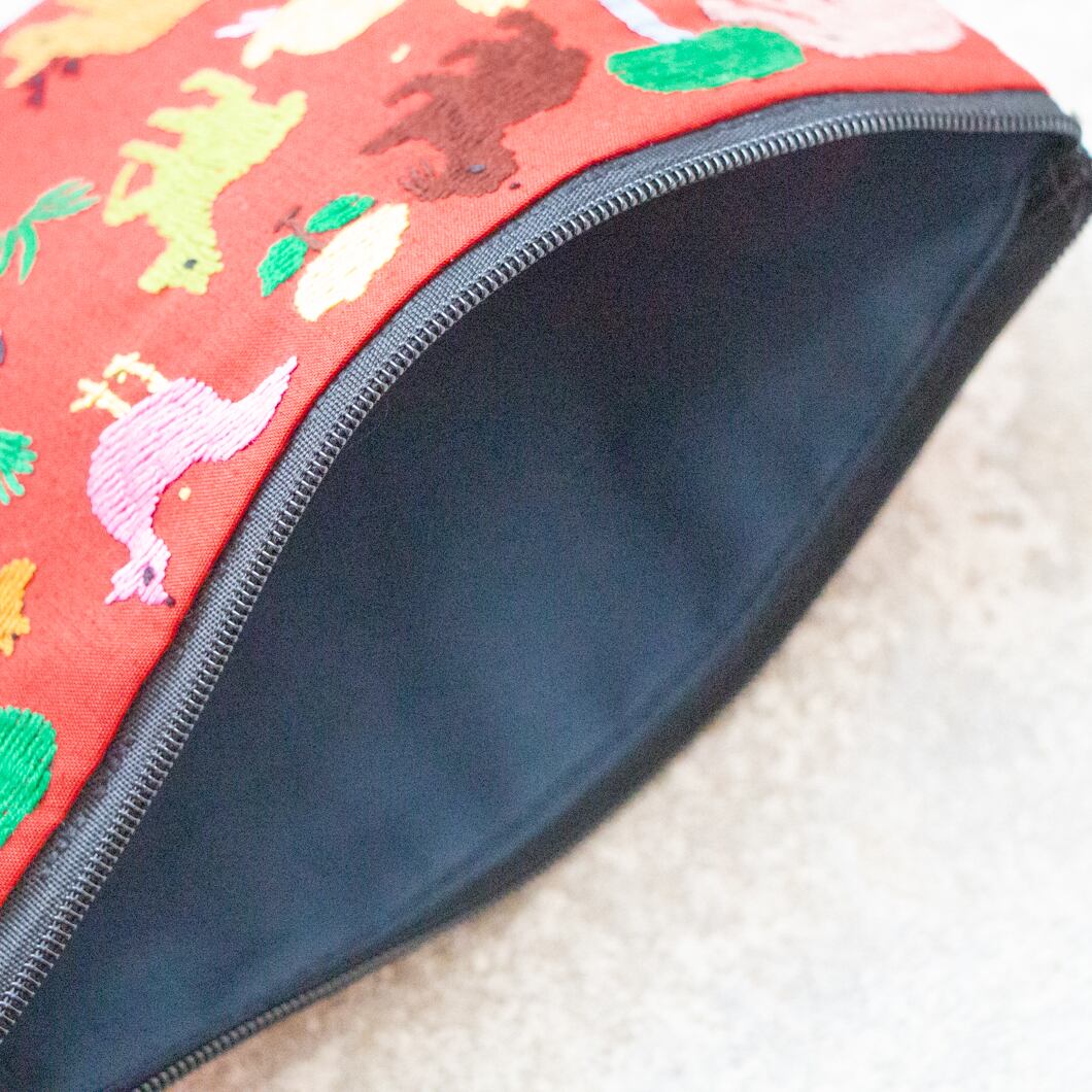 ラオス×モン族のアニマル刺繍ポーチL (レッド)