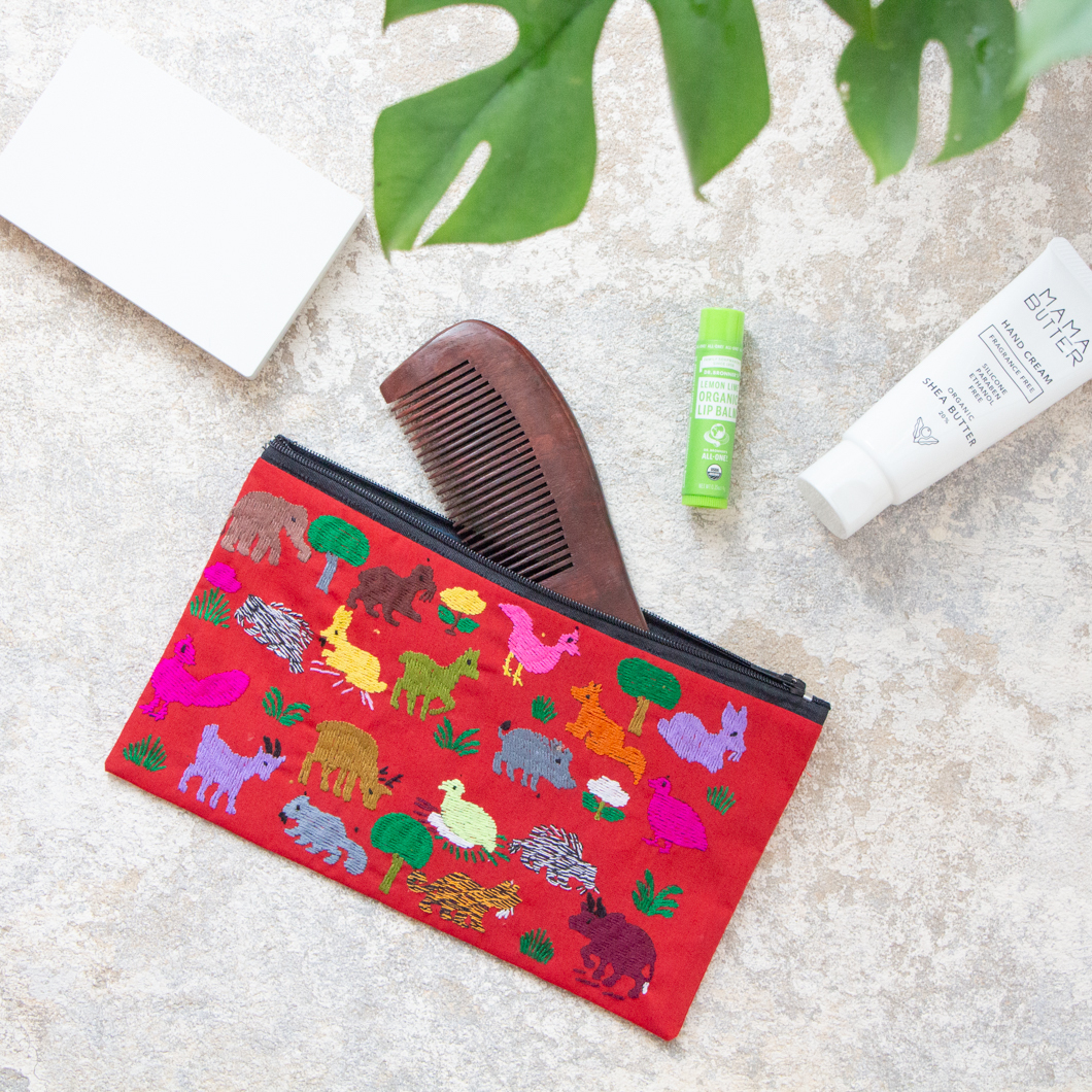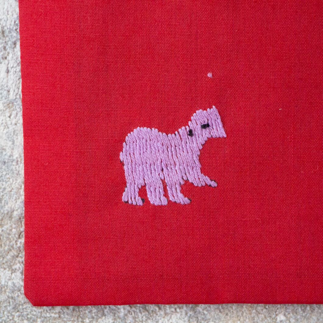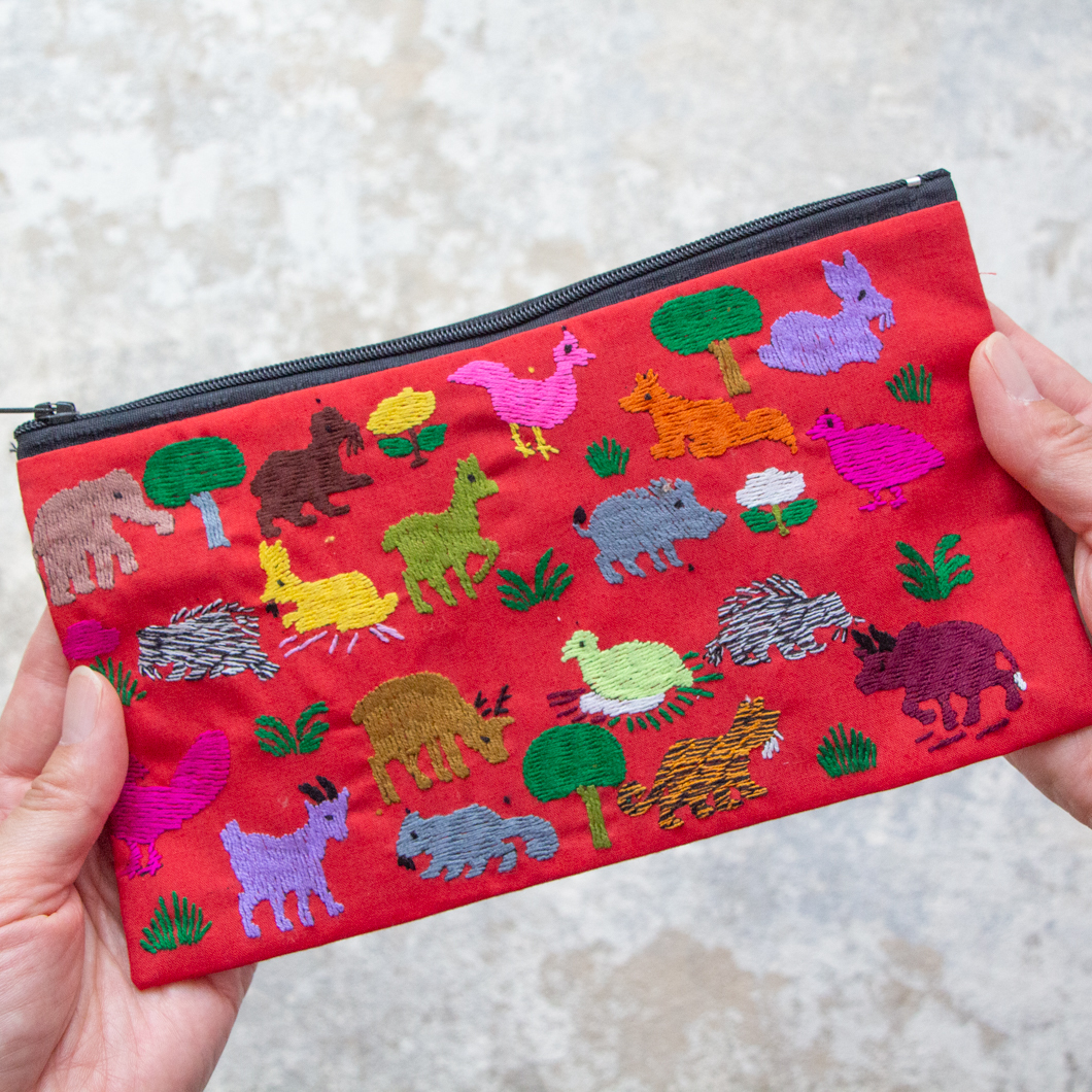 ラオス×モン族のアニマル刺繍ポーチL (レッド)