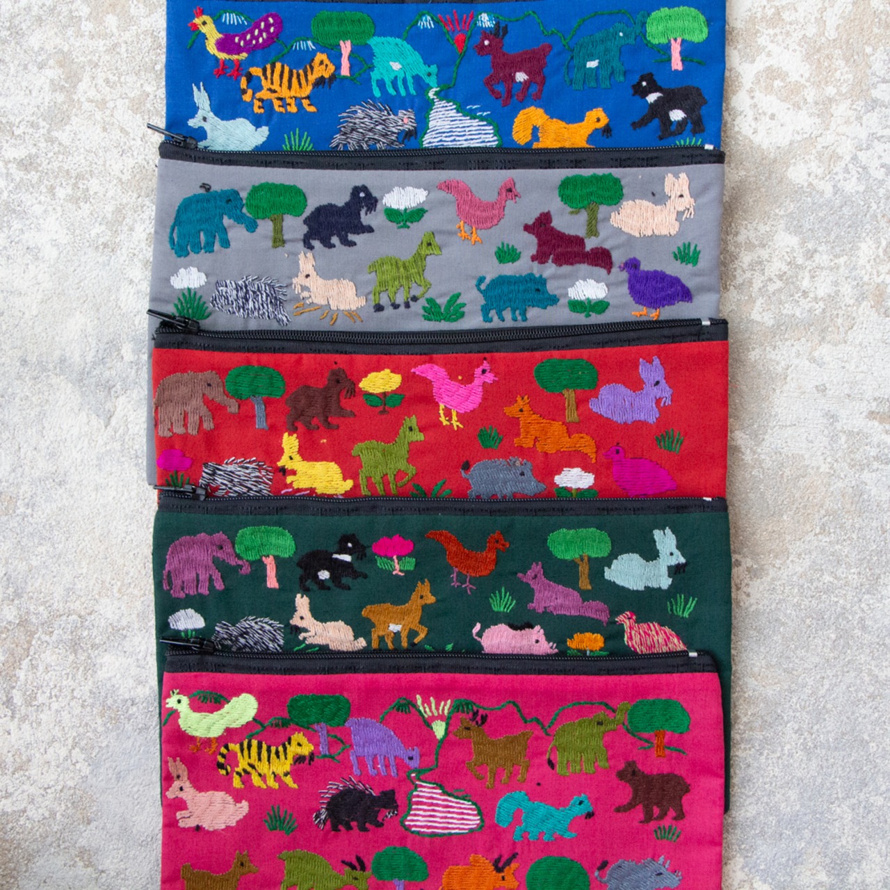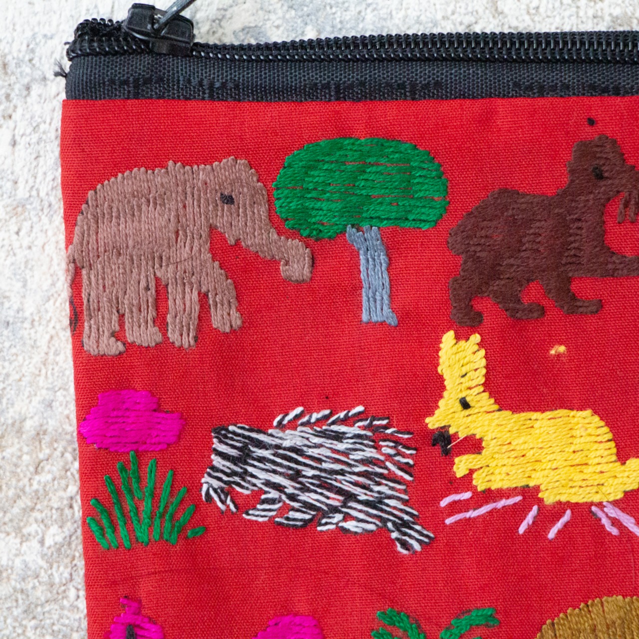 ポーチ全体に施された動物の刺繍は、ひとつひとつがモン族の女性による手仕事です。