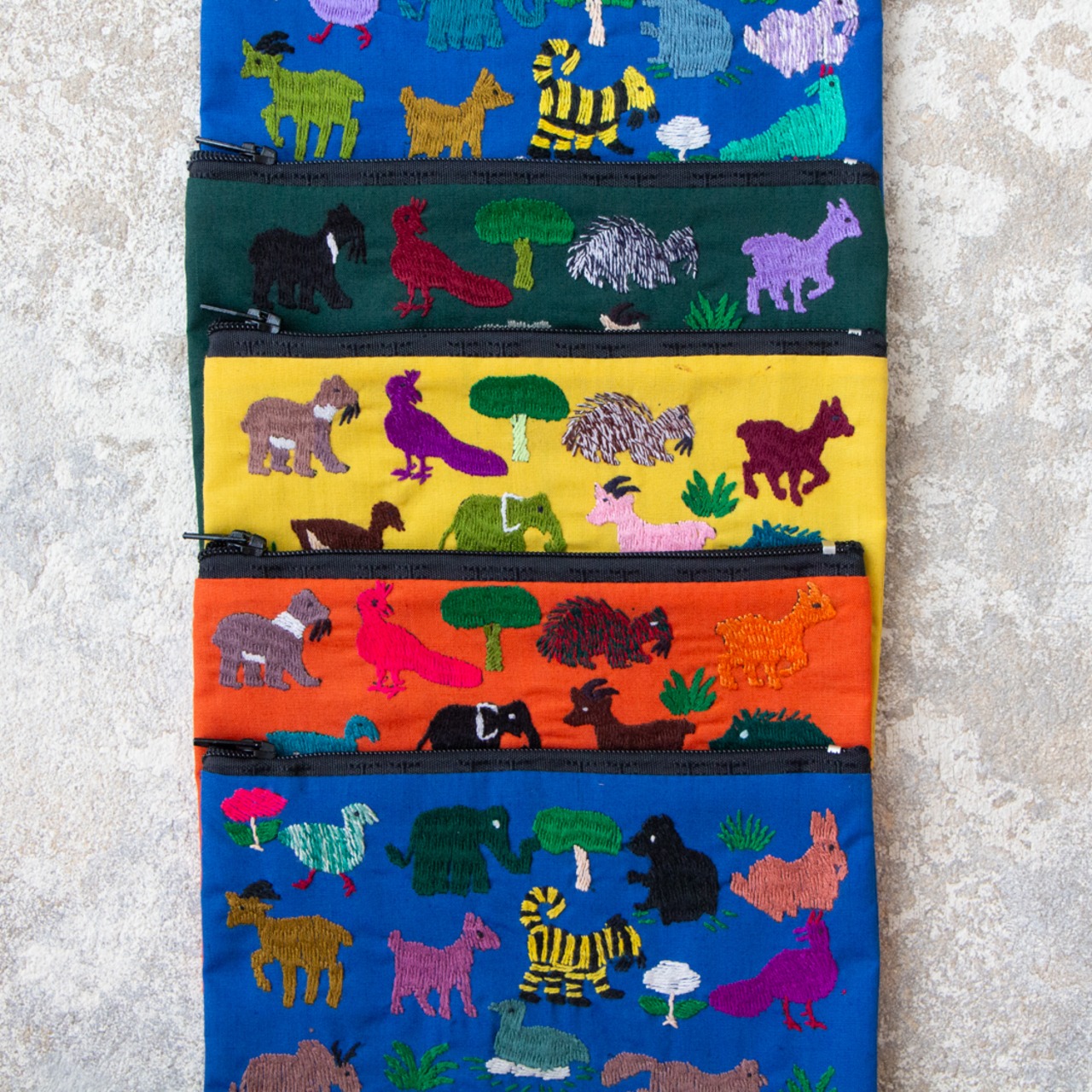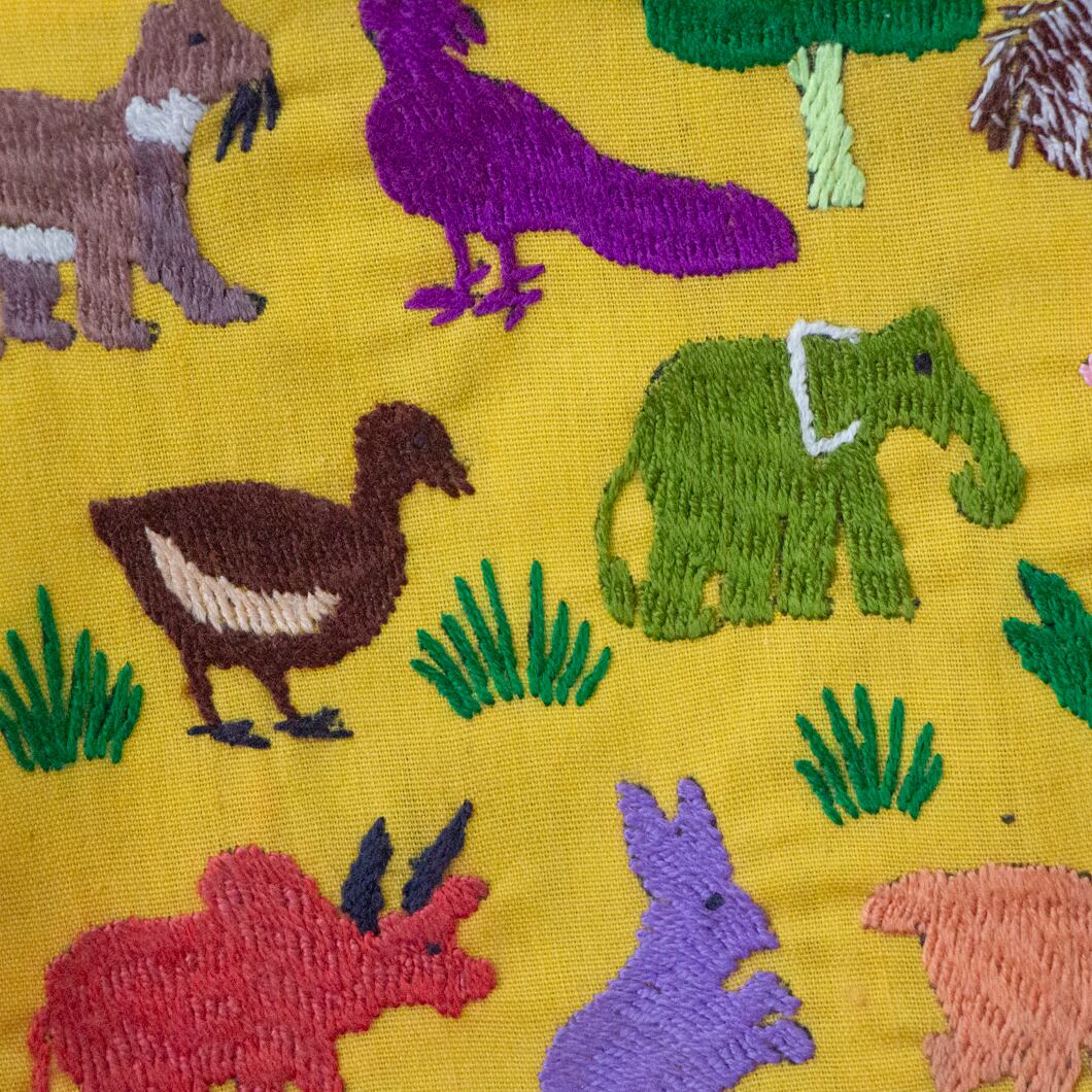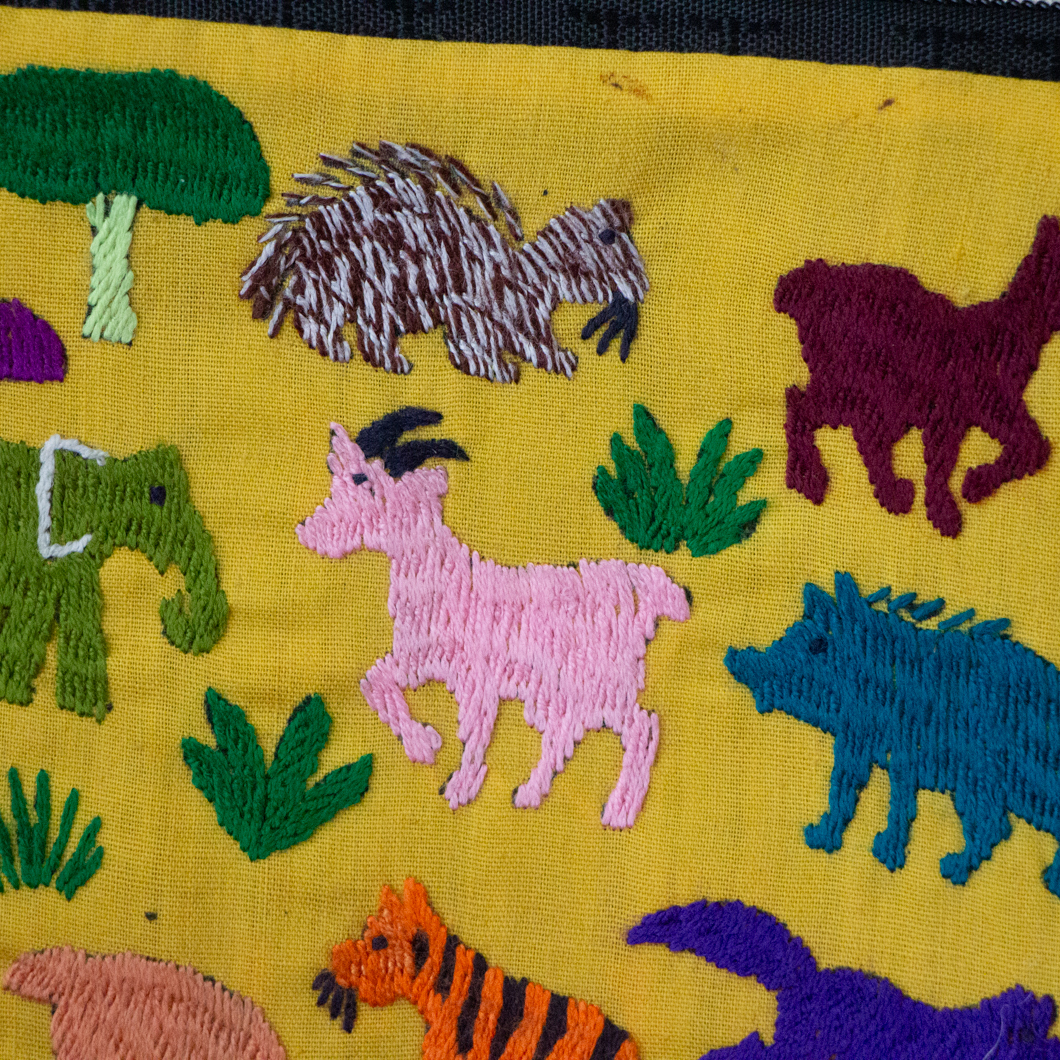 ポーチ全体に施された動物の刺繍は、ひとつひとつがモン族の女性による手仕事です。