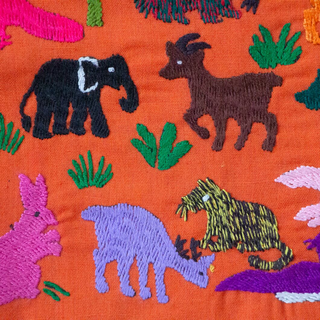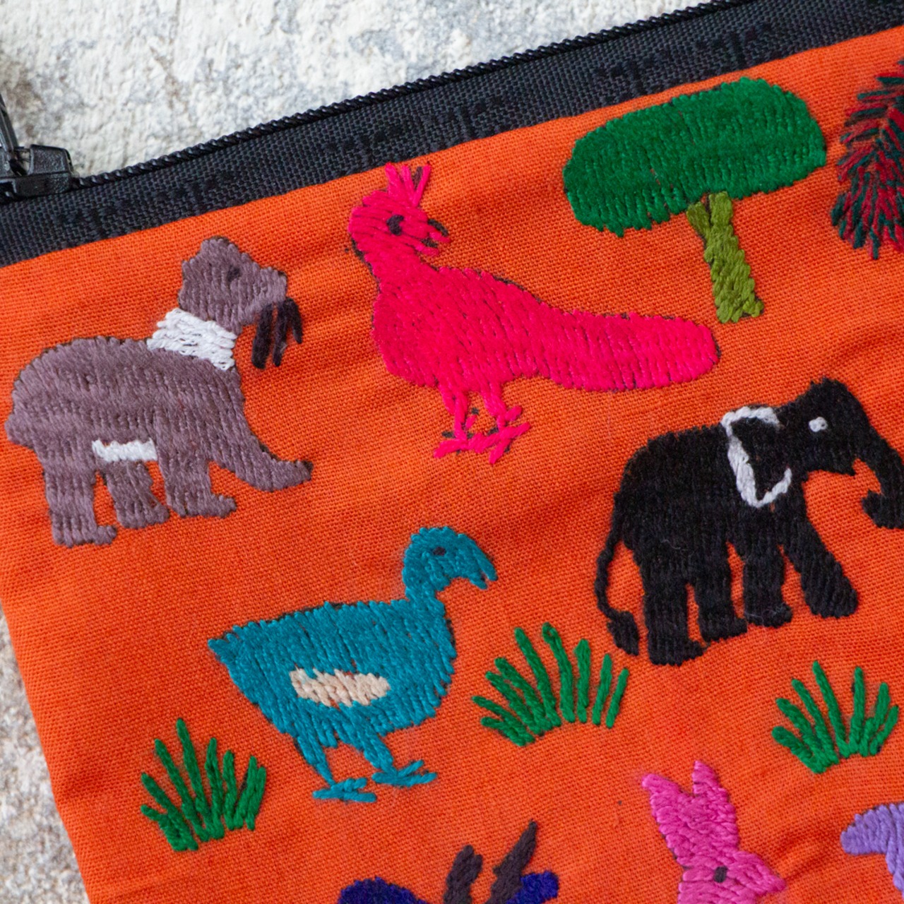 ポーチ全体に施された動物の刺繍は、ひとつひとつがモン族の女性による手仕事です。