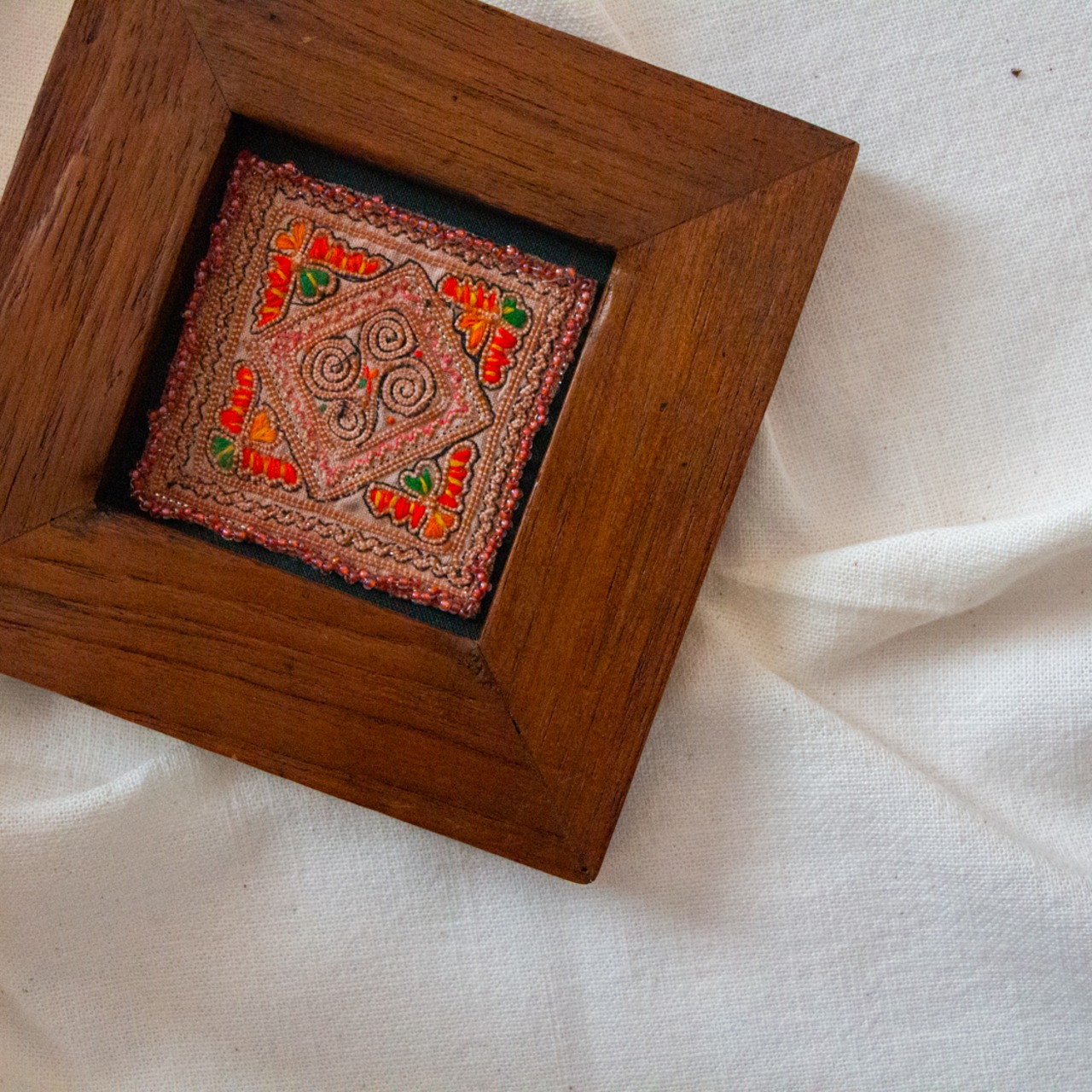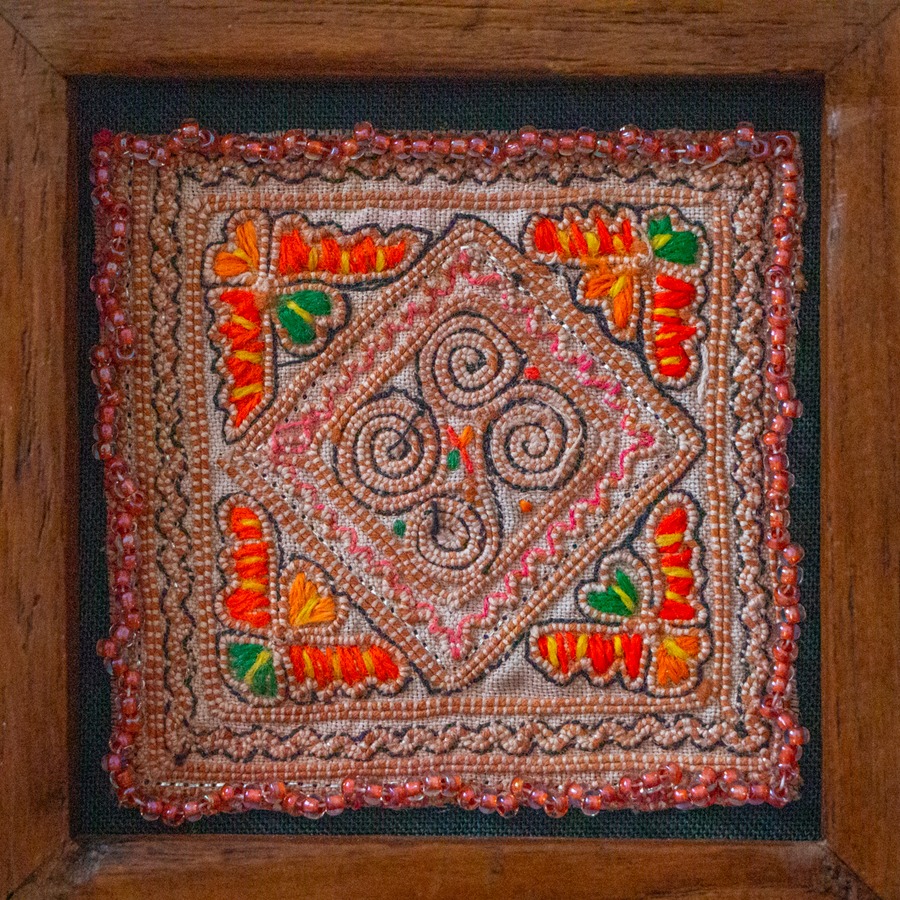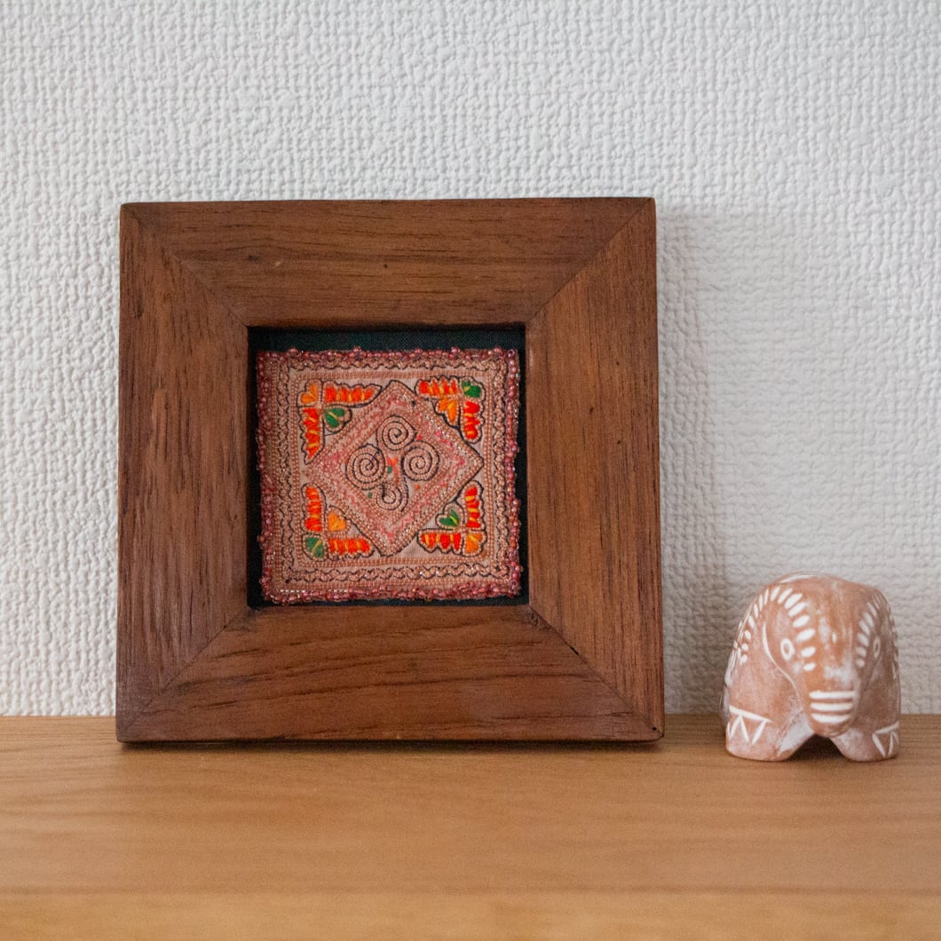 ラオスの可愛い模様の古布と、味わい深い木製の額縁の組み合わせ