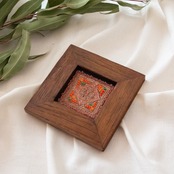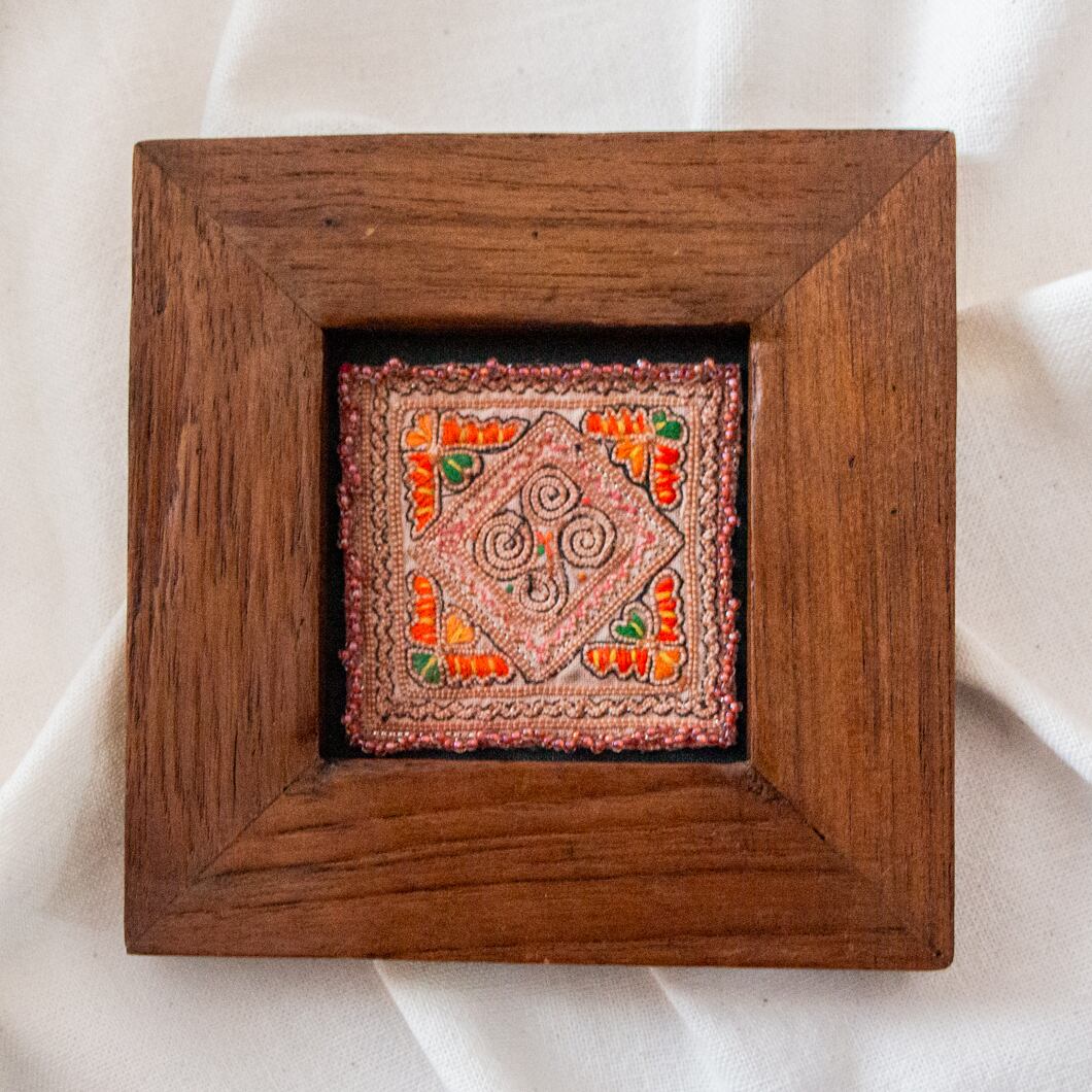 模様を引き立たせるため、周りにビーズをあしらい、インテリアとしてお楽しみ頂けるように、味わい深い木製の額縁に入れました。